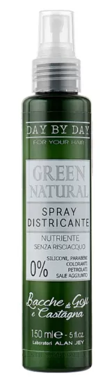 Спрей для полегшення розчісування Green Natural Spray Districante – мультивітамінний продукт із соком алое, ягодами годжі, каштаном біо та лавандою. Засіб підходить для будь-якого типу волосся і розплутує навіть неслухняні пасма. Спрей захищає волосся від термічного впливу, сприяє ефективному пом'якшенню пасм і надає їм еластичність. Не містить силіконів, парабенів та барвників.